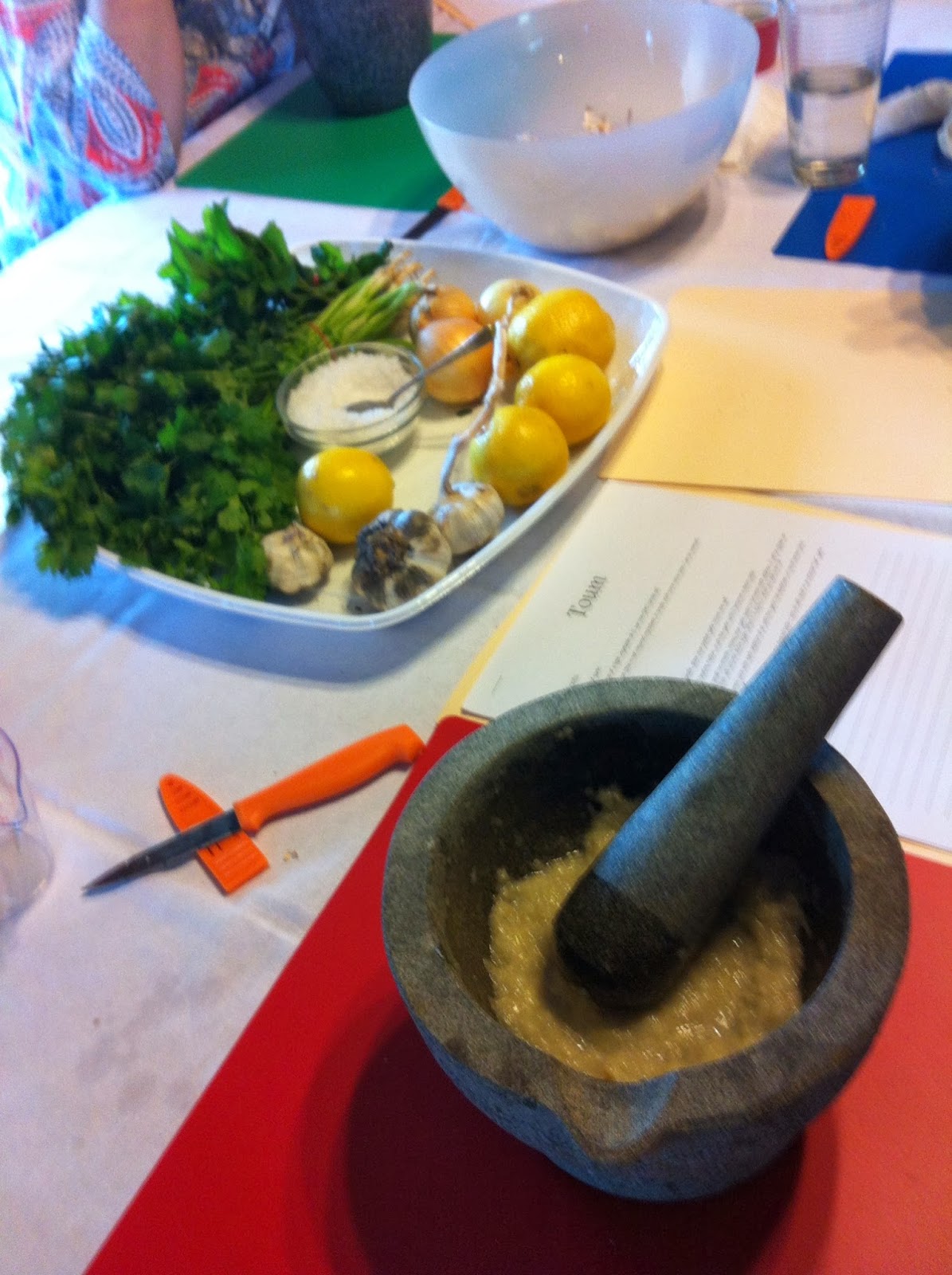 You can make it in a food processor, but as first time “Toumers” we used a mortar and pestle. Obviously it’s a slower process, but you can watch the garlic change to a silky paste and gauge when to add the oil. I found the smashing of garlic very relaxing , although Rita did mention I was a little bit over zealous with the smashing!!!